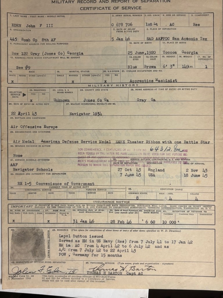 Several of his grandchildren have expressed interest in learning more about this story, which he rarely talked about when he was alive. He did leave a journal about the experience of being released, and there are several books that fill in the details of what life was like for a prisoner of war in the Nazi prison camps.